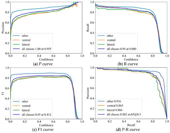 To further evaluate the performance of the PPR-YOLO model, Figure 10 presents the curves of precision, recall, and F1 scores as functions of the confidence threshold, as well as the precision–recall (P-R) curve. The results show that precision gradually increases with the confidence threshold, reaching 100% at a confidence value of 0.995 (Figure 10a). Meanwhile, recall exhibits a downward trend; once the piglet posture confidence rises to 0.94, recall drops to 0 (Figure 10b). The F1 score peaks at a confidence value of 0.412, indicating the optimal balance between precision and recall (Figure 10c). The P-R curve further confirms the model’s overall performance under different confidence thresholds. At an IoU of 0.5, the average accuracy for all piglet posture categories is 88.2% (Figure 10d). These findings demonstrate that PPR-YOLO maintains high detection accuracy and recall capability across various threshold settings.
