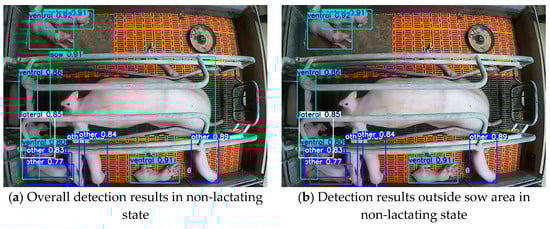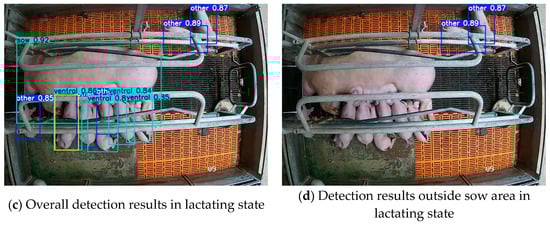 Figure 11 illustrates the detection results of sow targets and piglet postures. Specifically, Figure 11a,b show the detection results of overall and outside sow area piglet postures when the sow is not in the lactation state. Figure 11c and 11d depict the detection results during the sow’s lactation state, where overall and filtered outside sow area piglet postures are shown, respectively. When the sow is not in the lactation state, piglets generally move outside the sow’s bounding box, as indicated by the red rectangular markers in Figure 11b. However, due to piglets being at the edge of the enclosure and occluding each other, the model sometimes misclassifies ventral lying piglets as other postures. During the sow’s lactation state, as shown in Figure 11c, piglets exhibit severe stacking and suckling behaviors, leading to occlusion and potential missed detections. In contrast, Figure 11d demonstrates that piglets outside the sow area were successfully detected without misses.