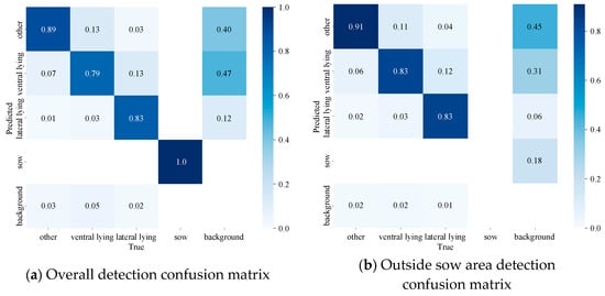 Figure 10 presents the confusion matrices for the detection results of sow targets and piglet postures in the test set. Specifically, Figure 12a,b correspond to the overall and outside sow area image detection results, respectively. The confusion matrices (a) and (b) do not show significant differences. From confusion matrix (a), it can be observed that the body size difference between sows and piglets is substantial, resulting in no recognition confusion. In terms of specific piglet posture recognition, certain postures are prone to be confused with adjacent postures. For example, piglets in a lateral lying posture are more likely to be recognized as ventral lying postures, while other postures (sitting, kneeling, and standing) require transitioning through ventral lying postures. Therefore, the feature differences are considerable, and the probability of confusion is low.