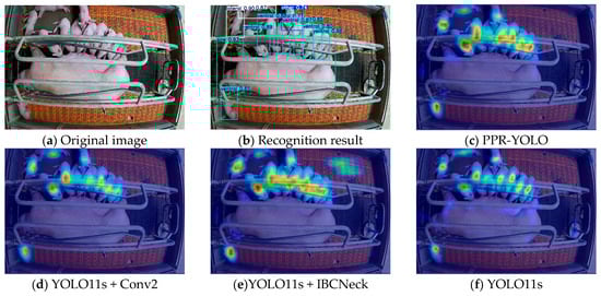 To enhance the interpretability of the improved PPR-YOLO model, Eigen-CAM [] was utilized to visualize the features of the last convolutional layer before the small target detection head in the detection model. As shown in Figure 13, Figure 13a is the original input image, Figure 13b shows the detection results of the proposed algorithm, and Figure 13c–f display the heatmaps of regions of interest for features under different improvements. The improvements in different modules (Figure 13d,e) show certain attention enhancements compared to the baseline YOLOv11s model (Figure 13f). However, when using only the IBCNeck module, some irrelevant regions are also focused on. The visualization results of the proposed algorithm (Figure 13c) compared to the original YOLOv11s model (Figure 13f) demonstrate that the improved model pays more attention to the piglet regions, suppresses interference from irrelevant areas, and focuses more on the detailed regions of individual piglets, facilitating the differentiation of different piglet postures.