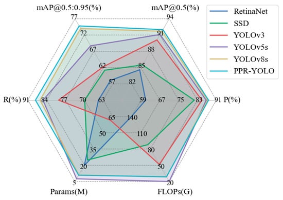 Figure 14 presents a comprehensive performance comparison of the different detection algorithms. In the figure, models that were positioned closer to the outer edge exhibit better performance. As seen in Table 7, the proposed PPR-YOLO model achieves mAP@0.5 and mAP@0.5:0.95 scores of 92.0% and 74.8%, respectively, significantly outperforming other models, especially in the high IoU threshold metric mAP@0.5:0.95. This indicates its superior detection capability in complex scenarios. The model has a parameter count of 10.8M, significantly lower than YOLOv3’s 61.5M, and is comparable to YOLOv8s’s 11.1M, highlighting its lightweight design, which reduces storage and computational resource requirements. In terms of computational complexity, although the PPR-YOLO model has 28.7 GFLOPs, which is slightly higher than YOLOv5s’s 17.5 GFLOPs, it achieves over 5% higher detection accuracy and nearly a 3% improvement in recall rate compared to YOLOv5s. This demonstrates a balanced advantage between performance and efficiency.