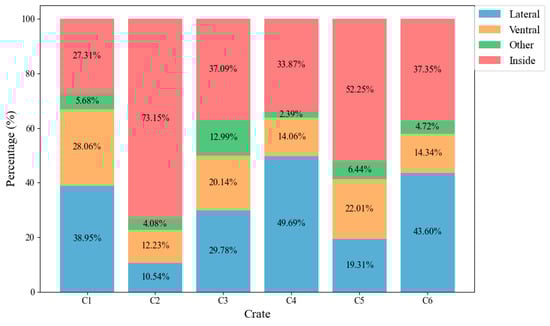 The proposed piglet posture detection algorithm, PPR-YOLO, was applied to continuous video detection. Six pens were selected, each housing between 6 and 11 piglets. Videos captured between 12:30 p.m. and 1:30 p.m. were selected for piglet posture detection, performing detection every 10 s. The distribution of piglet postures across different pens is shown in Figure 15, ordered from the smallest to the largest number of piglets. It was observed that in Pen C2, a higher proportion of piglets were located within the sow’s area, and the proportion of comfortable lateral lying postures was the lowest, indicating that piglets in this pen might have been experiencing hunger. In Pen C4, the highest proportion of lateral lying resting postures was observed, and the proportion of piglets within the sow’s area was only slightly lower than in Pen C1, suggesting that piglets in Pen C4 were in a more comfortable state. In Pen C1, the combined proportion of lateral and ventral lying resting postures was the highest, but the proportion of ventral lying was excessively high, indicating that piglets in this pen might have been experiencing stress or discomfort.