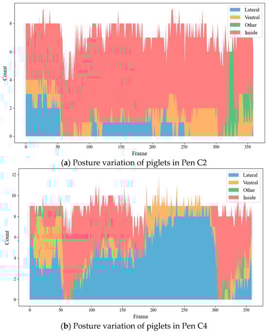 The posture distribution of piglets in Pens C2 and C4 over time is illustrated in Figure 16. In the figure, the horizontal axis represents the video frame index (every 10 s for a total of 1 h), while the vertical axis shows the distribution of piglet postures detected by the PPR-YOLO model at each moment in time. From bottom to top, the stacked legend denotes piglets in lateral lying, ventral lying, other postures, and piglets within the sow’s area, respectively. Due to factors such as pen layout and occlusion between piglets, the number of detected piglets fluctuated. In Pen C2, which housed seven piglets, two instances of sow lactation were observed in Figure 16a. During these times, 100% of piglets were within the sow’s area. The original video shows that during the second lactation, the sow refused to nurse, causing piglets to increase their movement within the pen (indicated by the green area), which also explains the reduced proportion of comfortable lateral lying postures. Over the entire hour, the percentages of piglets in lateral lying, ventral lying, other postures, and within the sow’s area were 10.54%, 12.23%, 4.08%, and 73.15%, respectively. In Pen C4, which housed nine piglets, two instances of sow lactation were also observed, but the piglets quickly transitioned to lateral lying postures with minimal transitional ventral lying postures, as shown in Figure 16b. This indicates that piglets in Pen C4 received sufficient milk intake and were in a satisfied state. Overall, the percentages of piglets in lateral lying, ventral lying, other postures, and within the sow’s area were 49.69%, 14.06%, 2.39%, and 33.87%, respectively.
