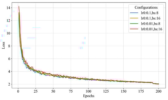 As shown in Figure 17, the loss curves for the PPR-YOLO model under different hyperparameter configurations reveal varying convergence characteristics. A high learning rate (0.1) combined with a small batch size (8) results in larger oscillations at the initial training stage, indicating that the model quickly adapts to gradient changes. However, it stabilizes after data augmentation is turned off in the final 10 epochs. By contrast, with a lower learning rate (0.01) and a larger batch size (16), the loss curve is smoother with smaller oscillations, indicating that the model converges more steadily. Overall, the PPR-YOLO model maintains high detection precision and recall under various learning rate and batch size combinations. Its performance is especially stable at larger batch sizes, demonstrating robust tolerance to hyperparameter variations for diverse practical applications.