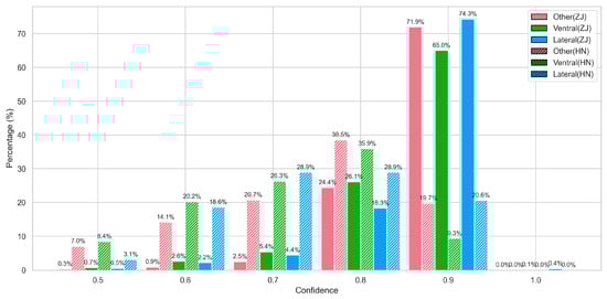 To assess the performance of the proposed PPR-YOLO model in new scenarios, this paper selected 500 monitoring images from a sow farrowing house at an experimental pig farm in Hainan for evaluation. Since the PPR-YOLO model in this study was not trained on data from this new setting, only the confidence of piglet resting posture predictions was analyzed. With the model’s confidence threshold set to 0.5, the percentage distribution for different confidence intervals was obtained and compared against the distribution in the test set. The results are shown in Figure 18, where the new scenario confidence distribution is represented with colored stripes. Compared with the confidence distribution of this study’s test set, piglet postures in the new farm scenario most frequently appear in the 0.8 confidence range, with an average proportion of 34.4%. By contrast, in this paper’s test set, most confidence values are above 0.9, with an average proportion of 70.4%.