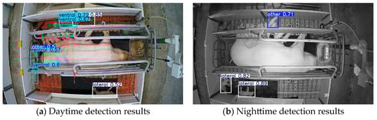 Some of the piglet resting posture recognition results of the PPR-YOLO model in the new scenario are illustrated in Figure 19. Figure 19a,b, respectively, display piglet posture detection during daytime and nighttime. In Figure 19a, piglets resting along the pen’s edge are heavily occluded, causing the model to misclassify some ventral lying postures as other postures. Figure 19b shows good recognition of piglet resting postures under nighttime conditions. However, the posture recognition confidence levels in this unfamiliar scenario are generally lower, suggesting increased uncertainty. Consequently, future efforts will involve applying transfer learning to further improve piglet posture recognition under unfamiliar conditions.