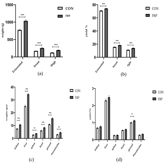 Effects of FBP on the carcass and organ weight in DYB chickens: (a) carcass weight; (b) carcass index; (c) organ weights; (d) organ index. Bar graphs indicate the mean of the variables. Error bars represent the standard error of the mean. The symbols *, **, and *** indicate significant differences between the groups. Different star symbols correspond to substantially different means (p < 0.05).