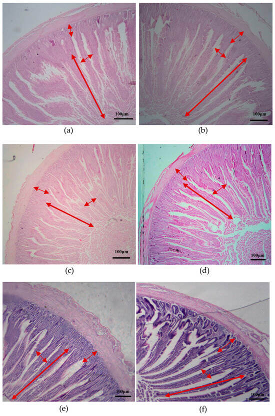 Morphology of the intestinal segments for the control and FBP feeding of the DYB chickens. (a,b) Duodenum of the CON and FBP groups; (c,d) Jejunum of the CON and FBP groups; (e,f) Ileum of the CON and FBP groups at 40× magnification. Scale bar = 100 µm. Red arrows show the villi height, villus width, and crypt depth.