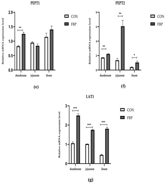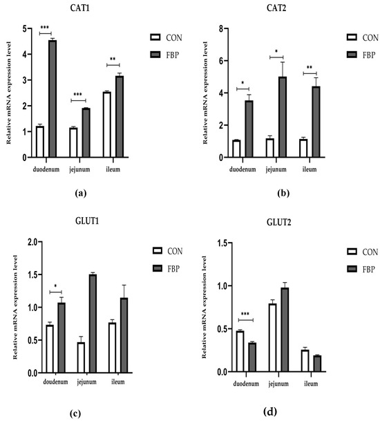 Figure 3 illustrates the examination of the mRNA expression levels for seven genes within the three major parts of the intestine, specifically, in the duodenum, jejunum, and ileum, after the addition of feed FBP. The FBP diet significantly enhanced the relative mRNA expression of CAT1, CAT2, PepT2, and LAT1 in the intestinal tract of the birds when contrasted with the CON diet group (p < 0.05). The FBP diet exhibited no discernible impact on the other genes examined, such as GLUT1, GLUT2, and PepT1, in comparison to the control group. Conversely, the FBP diet increased the relative mRNA expression level of GLUT in the jejunum.
