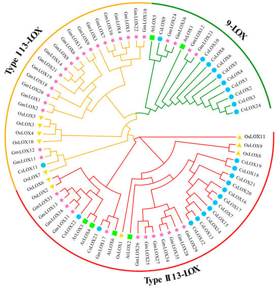 Select the protein sequences of the LOX family members from cucumber, Arabidopsis, rice, and soybean. The LOX protein sequences were obtained from Cucumber-DB (http://www.cucumberdb.com/, accessed on 10 August 2024) and the Phytozome 13 website (https://phytozome-next.jgi.doe.gov/, accessed on 10 August 2024). Phylogenetic analysis was conducted using MEGA11, with bootstrap testing performed using 1000 replicates, and the generated phylogenetic trees were graphically represented and beautified using Evolview (https://evolgenius.info//evolview-v2/#login, accessed on 15 August 2024).