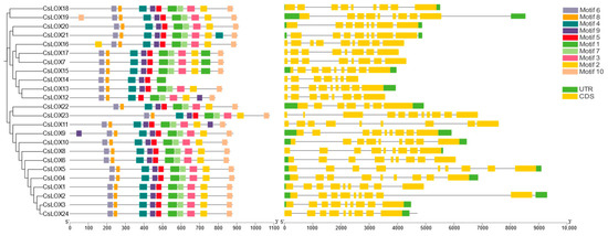 P Cucumber LOX family gene evolution, gene structure, and motif analysis, a maximum likelihood phylogenetic tree with 1000 replicates was constructed using MEGA 11. Ten conserved motifs are represented by boxes of different colors. Yellow boxes represent exons, gray lines represent introns, and green boxes represent UTR.