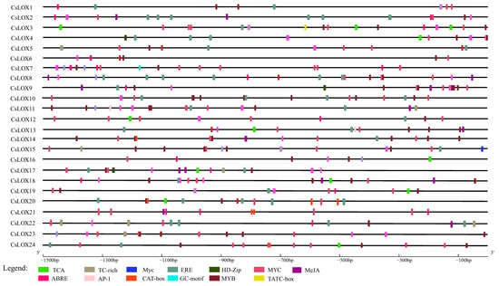 Cis-acting elements in promoters play a crucial role in regulating gene expression. These elements are located in non-coding regions of DNA, typically upstream of the transcription start sites [47]. Therefore, we selected a 1.5 kb 5′ flanking region upstream of the start codon of each CsLOX gene. After removing redundant findings, numerous regulatory elements associated with plant hormonal and stress signaling pathways were discovered within the promoter regions of the CsLOX genes (Figure 3). Hormone-related elements included TCA (salicylic acid responsiveness), ERE (ethylene response element), MeJA (methyl jasmonic-acid), ABRE (abscisic acid-responsive element), and TATC-box (gibberellin responsiveness). And stress-related elements included TC-rich (stress responsiveness), GC-motif (anoxic specific inducibility), and MYB binding site (MYB transcription factor binding site). Some other cis-acting elements were also detected on the promoter, including HD-Zip (Protein binding site), AP-1 (activating protein-1), CAT-box (meristem expression), and MYC. All CsLOX genes contain hormone-related cis-acting elements, and most CsLOX genes contain stress-related cis-acting elements. This may reveal the potential roles of CsLOXs in hormone pathways and stress responses.