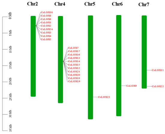 Map the CsLOX genes on chromosomes, with the approximate positions of the 24 CsLOX genes indicated on the right of the chromosome diagrams.