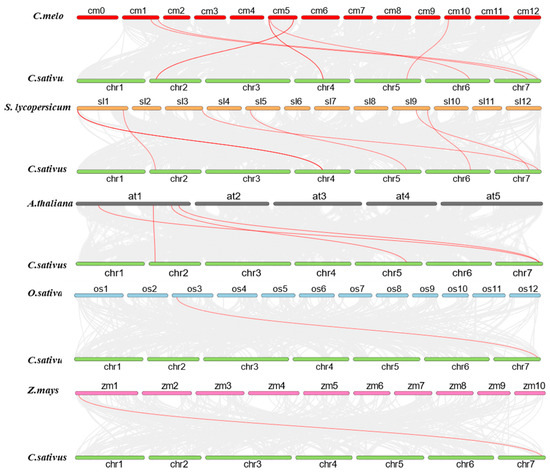 Collinearity analysis of LOX genes between C.sativus, C. melo, S. lycopersicum, A. thaliana, O. sativa, and Z. mays: Collinear blocks are marked with gray lines, while collinear gene pairs with LOX genes are highlighted with red lines.