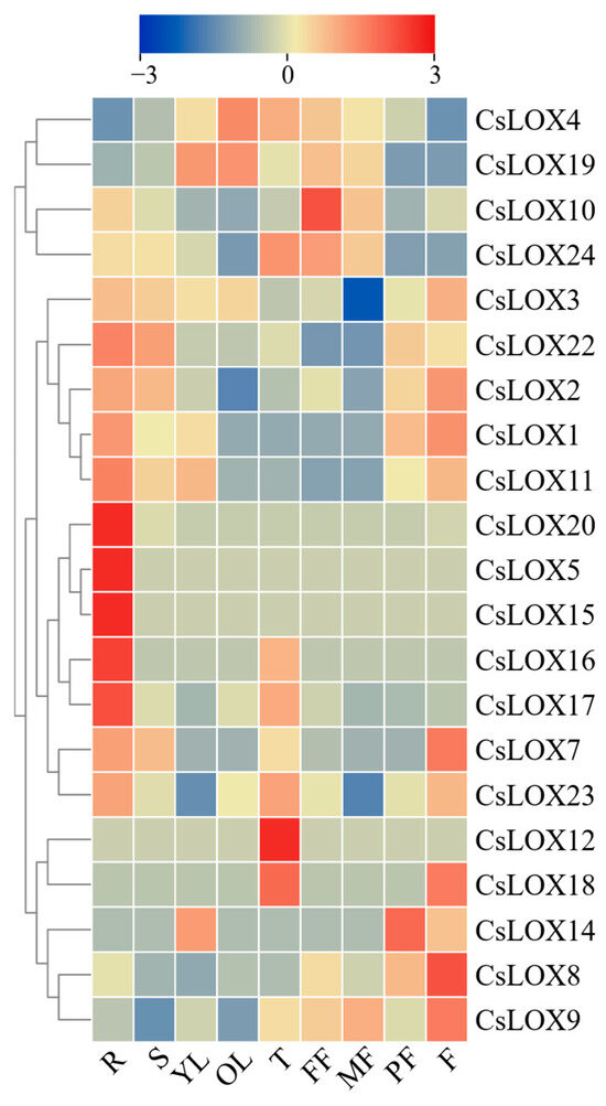 The tissue-specific expression may be linked to gene function. We downloaded transcriptome data from Cucumber-DB for various cucumber tissues, analyzed the expression levels of CsLOXs across these tissues, and generated a heatmap for visualization (Figure 6). The results indicated that CsLOX1 and CsLOX2 were expressed in cucumber roots, stems, leaves, and fruits at different developmental stages. CsLOX3 was expressed in all tissues except tendrils. CsLOX9, CsLOX10, CsLOX19, CsLOX22, CsLOX23, and CsLOX24 were ubiquitously expressed across all tissues. CsLOX12 was specifically expressed in tendrils, while CsLOX5, CsLOX15, CsLOX16, and CsLOX20 were predominantly expressed in roots. These findings suggest that CsLOX genes may play diverse roles in cucumber growth and development.