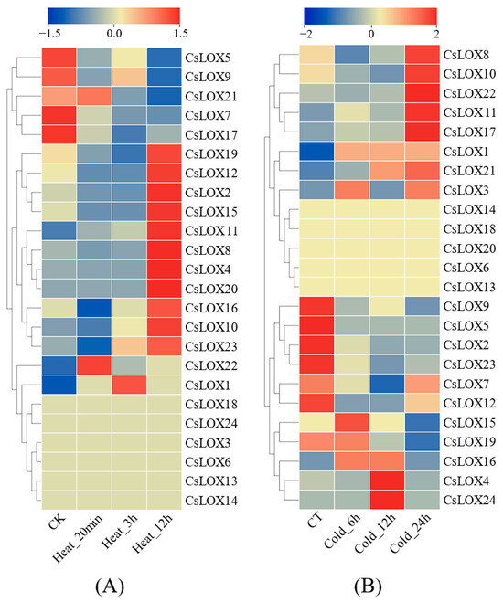 The expression of CsLOXs under heat and cold treatment. (A) The heatmap shows the expression pattern of CsLOXs after 12 h of heat stress. (B) The heatmap shows the expression pattern of CsLOXs after 24 h of cold stress. The color on the scale represents Log2 (FPKM) value, blue represents low level, and red represents high level. Table S3 lists the FPKM values of CsLOXs under heat and cold stress.