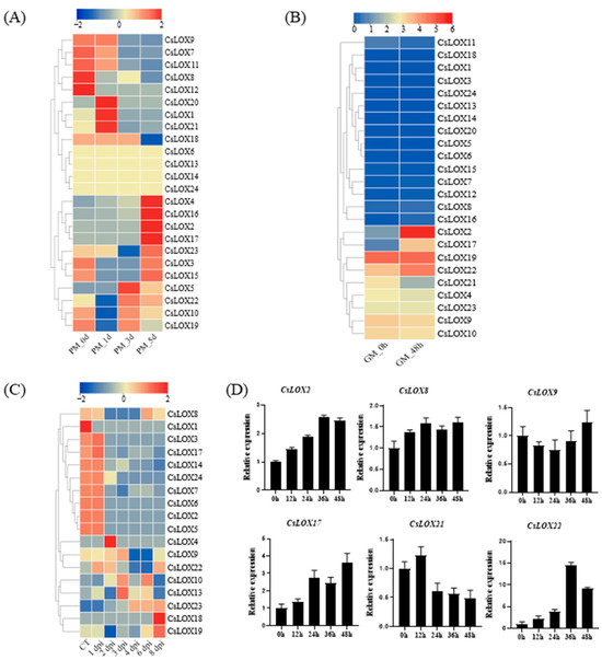 The expression of CsLOXs under powdery mildew (PM), gray mold (GM), and downy mildew (DM) treatments. (A) The heatmap shows the expression pattern of CsLOXs at five days under PM stress. (B) The heatmap shows the expression pattern of CsLOXs at 48 h under GM stress. (C) The heatmap shows the expression pattern of CsLOXs at right days under DM stress. The color on the scale represents Log2 (FPKM) value, blue represents low level, and red represents high level. Table S3 lists the FPKM values of CsLOXs under heat and cold stress. Table S3 lists the FPKM values of CsLOXs under PM, DM, and GM stress. (D) qRT-PCR analysis of CsLOXs expression in cucumber seedlings inoculated with gray mold (GM) at 0, 12, 24, 36, and 48 h, with cucumber actin gene as a reference gene. Error bars illustrate the standard error of the mean, with n = 3 indicating the number of replicates.