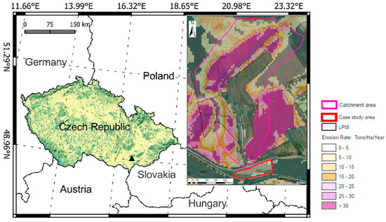 Localization of the study area (▲) with the detailed description of the research location (right side) where the erosion risk is evaluated in tons of eroded soil per hectare per year and marked by color range from white 0–5 t ha−1 yr−1 to purple (˃30 t ha−1 yr−1).