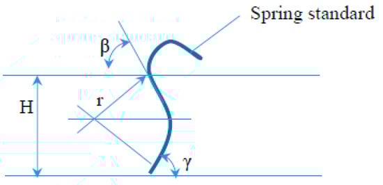 The working tool of the plowshare (range of spring standards) and its parameters. r—spring standard radius, H is the height of the spring standard with a working blade; we suggest 0.5–0.7 m, roll angle β (45–65°), cutting angle γ (45–55°).