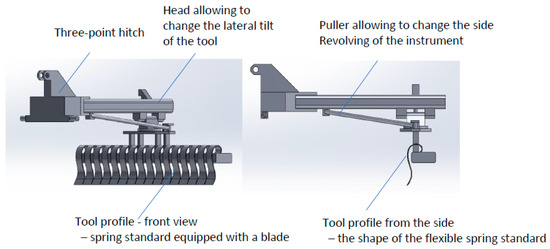 The width of the tool (rows of standard springs) should be 200–300 mm longer than the width of the chassis of the towing mobile energy vehicle. The width of one part of the standard spring is approximately 100 mm. The placement of the standard springs on the frame must ensure minimum passage and the possibility of cutting—20 mm (a gap of 20 mm must be created between individual standard springs). The standard material will consist of strip spring steel, which helps overcome the resistance during the cutting, crowding, and the soil friction without changing the tool shape.