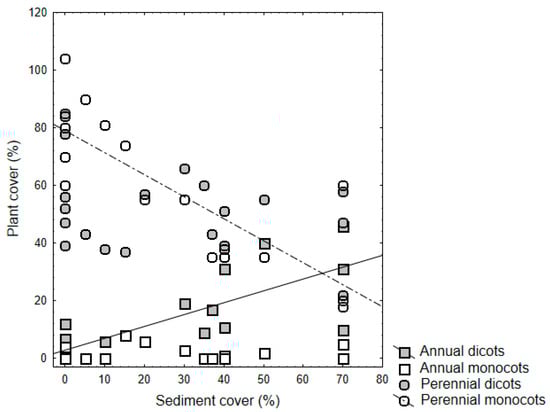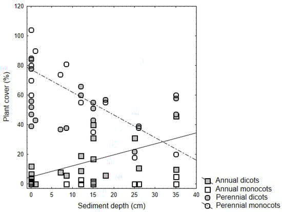 A positive relationship was found for annual dicots cover, which increased significantly with a higher sediment area and sediment depth in the plots (R2adj = 0.577, F1,18 = 26.9, p < 0.001, and R2adj = 0.378, F1,18 = 12.6, p < 0.01, respectively). A negative relationship was found in the case of perennial monocots, where the cover of plants significantly decreased with the sediment area and depth (R2adj = 0.657, F1,18 = 37.4, p < 0.001, and R2adj = 0.546, F1,18 = 23.9, p < 0.001, respectively). Covers of annual monocots and perennial dicots were not affected by the sediment area or depth (Figure 4 and Figure 5).