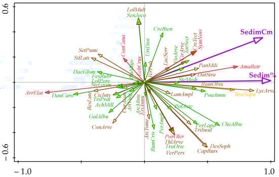 Relationships of recorded plant taxa and erosional sediment characteristics (RDA analysis result; total explained variability = 24.1%, F ratio = 2.3, p-value = 0.002). Legend: Sedim%—area of erosional sediment; SedimCm—strength of erosional sediment. Species with invasive status are marked with red, species with casual status are marked with yellow, species with naturalized status are marked with brown, species with native status are marked with green.