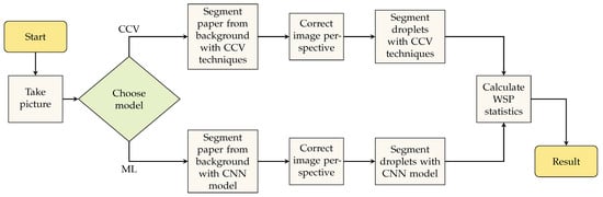 The main goal of the system is to develop an Android application tool for real-time assessment of spray quality on WSP. The client-side Android application captures an image of the WSP and sends it to the server side. The server analyzes the image, provides droplet statistics, and sends the results back to the client. The server-side application uses a dual-method algorithm that can use CCV or ML techniques to accurately segment water-sensitive paper and droplets. The primary objective of both algorithms is to detect and separate overlapped droplets, ensuring that droplets that overlap are counted as separate entities for statistical purposes. Both of the developed methods follow an equivalent logic, as follows: detect the WSP, remove distortion, segment individual droplets, and calculate the WSP statistics. This dual-algorithm approach allows us to directly compare distinct methods of analyzing WSPs. For a visual representation of the proposed solution, refer to Figure 1.