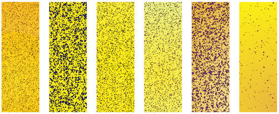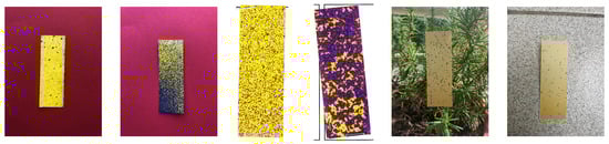 The tools used include semi-rigid papers, coated with bromothymol blue on one side, available in various sizes. The coating appears yellow when dry but turns different shades of brown, blue, and purple when it comes into contact with water droplets. These stains create a significant contrast with the dry yellow background, making it easier to assess the dispersion of the droplets [2,3,8]. However, this method faces limitations such as the inability to measure droplets smaller than 50 µm [3,6], sensitivity to high humidity [4,8], and inaccuracies with high coverage [5]. These limitations require alternative methods for accurate spray analysis.