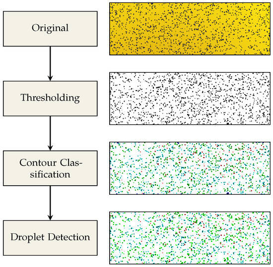 - Thresholding: The segmentation begins by blurring the image to reduce noise, enhancing clarity. Otsu’s thresholding method is then applied to automatically separate droplets from the background. The Otsu method [19] stands out as particularly effective in the domain of this study [20,21].
