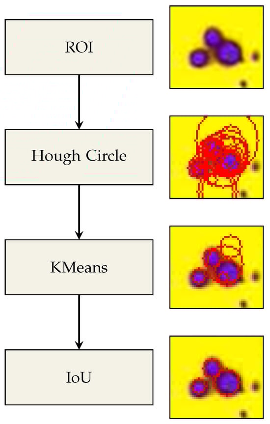 - Droplet instance segmentation: For circles and ellipses, the area is calculated and the information is saved. For shapes classified as overlapping droplets, the Hough Circle Transform [22] is applied to detect potential circles in the shape. The functions return a considerable amount of circles all clutched together. To further refine the circle detection, the KMeans method of the class cluster of sklearn is applied, with the idea of grouping similar circles by clustering and removing outliers. This helps in managing overlapping droplets by consolidating multiple detections into a single, more accurate representation. The final step is to remove circles that contribute negatively to the overall IoU (Intersection over Union) score. This IoU score is computed by comparing the threshold image of the detected shape in the ROI (region of interest) with the detected circles minus one of them. If the value of the IoU is better without a certain shape, then it is filtered out of the final detected circles. The visual representation of this pipeline is described in Figure 8.