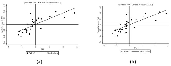 The spatial structure of the SAR model is defined by the spatial weight matrix, and W is constructed using the inverse of the geographic distance between provinces, with the diagonal elements set to zero to exclude self-influence. The parameter is the spatial autoregressive coefficient that estimates the magnitude of spatial spillover effects, and WlnINC represents the spatial lag of the dependent variable lnINC.