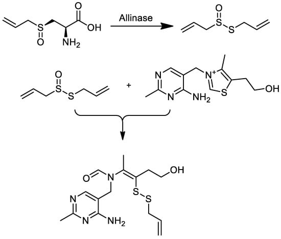 Biosynthetic pathway of allithiamine formation from alliin via allicin and thiamine.