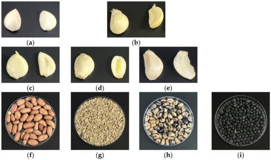 The garlic and grain raw materials, Jeju garlic (a), Muan garlic (b), Namhae garlic (c), Uiseong garlic (d), Yeongcheon garlic (e), A. hypogaea (f), A. sativa (g), P. vulgaris (h), and R. nulubilis (i).