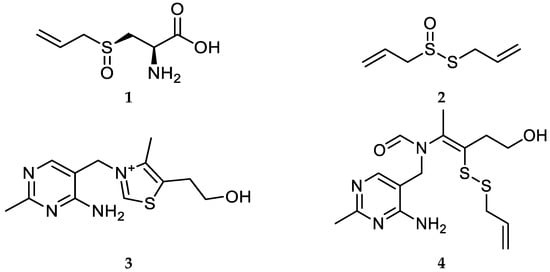 Chemical structures of alliin (1), allicin (2), thiamine (3), and allithiamine (4).