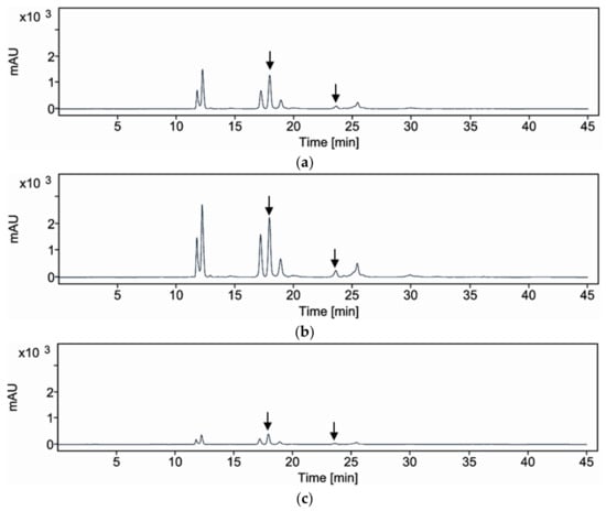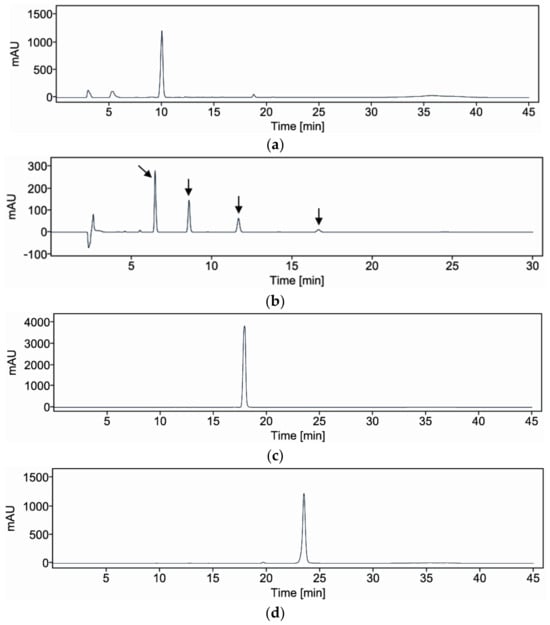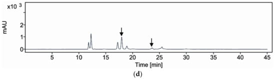 The HPLC analysis was conducted using an Agilent 1260 Infinity II Quaternary Pump system equipped with a UV detector, following the methods described in previous studies [24]. Separation was achieved using a YMC Pack Pro C18 column (4.6 × 250 mm, 5 μm) maintained at 30 °C. The injection volume was set to 10 μL. The mobile phase consisted of an isocratic mixture of water containing 0.1% phosphoric acid (solvent A) and ACN (solvent B) at a ratio of 25:75. The flow rate was 1.0 mL/min. The analytes were detected at a wavelength of 208 nm (Figure 5). The mobile phase composition remained constant throughout the analysis, with solvents A and B maintained at 25% and 75%, respectively, for 30 min.