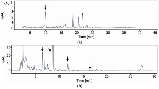 Reversed-phase HPLC analysis was performed on an Agilent 1260 Infinity II system equipped with a Quat Pump and UV detector, using an Aegispak C18-L column (3.0 × 150 mm, 5 μm) at 30 °C. A sample injection volume of 10 µL was used. The mobile phase consisted of 20 mM sodium dihydrogen phosphate monobasic and 10 mM 1-heptane sulfonic acid sodium salt in water, with the pH adjusted to 2.2 using phosphoric acid as solvent A and a mixture of ACN and solvent A (50:50) as solvent B for alliin and the MeOH as solvent B for thiamine and allithiamine. The flow rate was set to 0.3 mL/min. The detection wavelength was 208 nm for alliin and 254 nm for thiamine and allithiamine (Figure 5). The mobile phase gradient was programmed as follows: 0% B at 0 min, 30% B at 5 min, 54% B at 25 min, and 100% B from 30 to 32 min, followed by re-equilibration at 100% A from 37 to 45 min. Following previous reports, the analysis was performed under these conditions to ensure complete separation and detection of the target compounds [25,26].