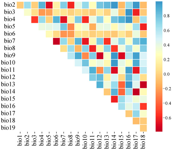 Correlation heatmap of bioclimatic factors (dark blue and dark red indicate that the absolute value of the correlation coefficient is greater than 0.8. The colors gradually transition from the sides towards the center, with the absolute value of the correlation coefficient also decreasing accordingly).