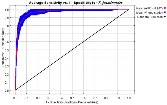 T. jasminoides is not only an important medicinal herb with significant value, but it also plays a role in improving air quality and reducing pollution, offering certain ecological benefits [8]. Currently, research on the suitable distribution of T. jasminoides remains limited. To address this, this research combines the MaxEnt model and ArcGIS. Based on the current niche hypothesis of Trachelospermum jasminoides, it predicts its potential favorable survival areas under current climate conditions and the changes in suitable survival areas under different future climates. Additionally, this research pinpoints the crucial environmental factors that restrict its optimal growth. These findings provide a scientific basis for the cultivation, conservation, and resource utilization of the species amidst climate change. The MaxEnt model, a popular ecological niche model, is renowned for its precision in predicting species distributions. Studies have indicated that, given known conditions, the higher the entropy of a species, the more accurate the prediction is [24]. The high AUC value of the MaxEnt model attests to its accuracy and reliability. The AUC value of 0.967 achieved in this research suggests that the MaxEnt model offers an extremely reliable and precise prediction of the distribution of T. jasminoides.