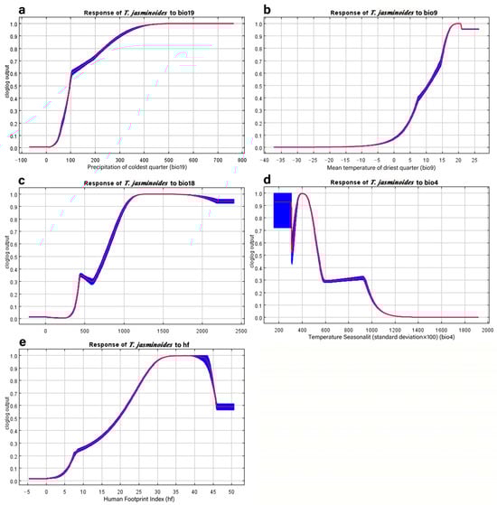 Response curves of dominant environmental factors ((a) denotes the response curve of the presence probability of T. jasminoides to the precipitation of coldest quarter; (b) denotes the response curve of the presence probability of T. jasminoides to the mean temperature of driest quarter; (c) denotes the response curve of the presence probability of T. jasminoides to the precipitation of warmest quarter; (d) denotes the response curve of the presence probability of T. jasminoides to the temperature seasonality (standard deviation × 100); (e) denotes the response curve of the presence probability of T. jasminoides to the human footprint index).