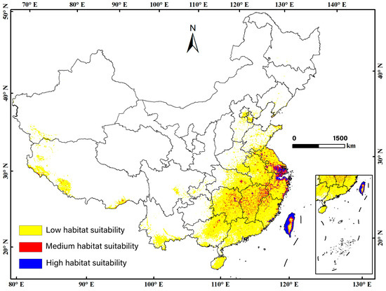 Optimal survival areas for T. jasminoides under current climate conditions (yellow represents low suitable habitat distribution, red represents moderate suitable habitat distribution, and purple represents high suitable habitat distribution).