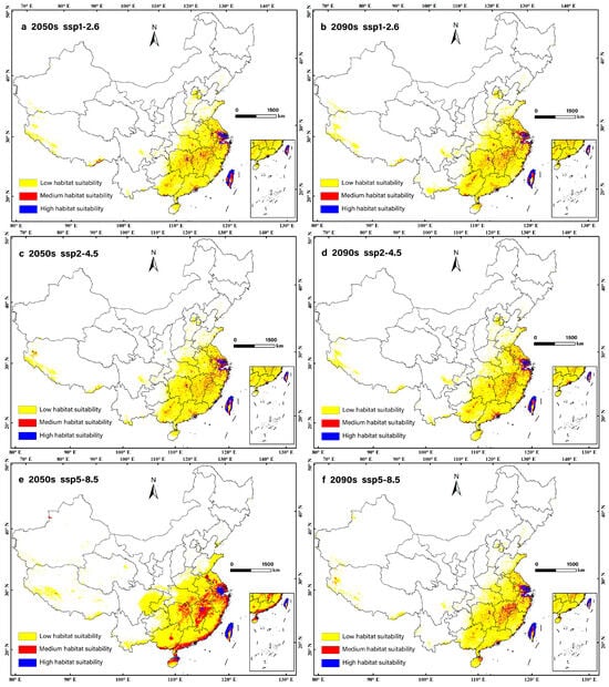 Optimal survival areas for T. jasminoides under future climate conditions: (a) optimal survival area distribution of T. jasminoides under the SSP1-2.6 scenario in the 2050s; (b) optimal survival area distribution of T. jasminoides under the SSP1-2.6 scenario in the 2090s; (c) optimal survival area distribution of T. jasminoides under the SSP2-4.5 scenario in the 2050s; (d) optimal survival area distribution of T. jasminoides under the SSP2-4.5 scenario in the 2090s; (e) optimal survival area distribution of T. jasminoides under the SSP5-8.5 scenario in the 2050s; (f) optimal survival area distribution of T. jasminoides under the SSP5-8.5 scenario in the 2090s. Yellow indicates areas of low suitability, red indicates areas of moderate suitability, and purple indicates areas of high suitability.