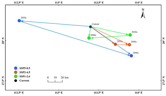 Under different climate hypotheses, the movement of the centroid of suitable survival areas for T. jasminoides varies. In general, under the high-emission SSP5-8.5 hypothesis, the change in the suitable survival center of this species is more pronounced. However, in the medium-emission SSP2-4.5 and low-emission SSP1-2.6 hypotheses, the movement distance of the centroid is relatively small (Figure 8). At present, the centroid of jasmine is located in Liuyang Town, Liuyang City, Hunan Province (113.40° E, 28.17° N). Under the SSP1-2.6 emission hypothesis, from now to the 2050s, the centroid will move southeast by 50.45 km to Wenjia Town, Liuyang City (113.90° E, 28.07° N). From the 2050s to the 2090s, the centroid will move further southwest to Zhentou Town, Liuyang City (113.38° E, 28.03° N), a shift of 51.67 km. In the SSP2-4.5 scenario, the centroid will move 37.83 km southeast by the 2050s, with a further 17.60 km shift southeast from the 2050s to the 2090s. In the SSP5-8.5 emission hypothesis, by the 2050s, the centroid of the suitable survival area will move 89.77 km to the northwest, to Baimaqiao Street, Ningxiang City, Hunan (112.50° E, 28.25° N). From the 2050s to the 2090s, the centroid will shift 147.09 km southeast to Dongyuan Township, Shangli County, Jiangxi Province (113.90° E, 27.81° N).