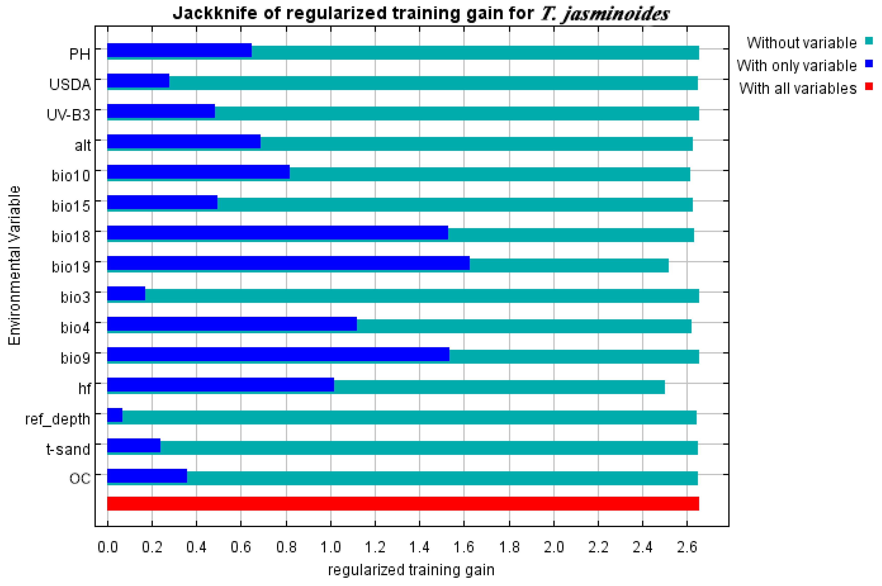 This study used the MaxEnt model to assess the contribution rates of various external factors to the prediction of dominant distribution areas (Table 2). The key climate variables include precipitation of coldest quarter (Bio19, 55.3%), human footprint index (hf, 10.5%), and temperature seasonality (Bio4, 9.8%), with the top three environmental variables contributing a total of 75.6%. Environmental factors are ranked according to their importance for the MaxEnt model; precipitation of coldest quarter (Bio19, 63.3%) and elevation (alt, 18.9%) were found to have the highest importance, with a combined contribution of 82.2%. Through Jackknife validation (Figure 4), the correlation analysis of 15 selected environmental variables revealed that the environmental variable with the highest gain when modeled individually was precipitation of coldest quarter (Bio19), followed by mean temperature of driest quarter (Bio9), precipitation of warmest quarter (Bio18), temperature seasonality (Bio4), and human footprint index (hf). To sum up, rainfall, temperature, and human actions are the main environmental elements affecting the distribution of ideal habitats for T. jasminoides.