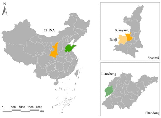 The data used in this study were collected from a household survey conducted by the research team from July to August 2022 in Shaanxi and Shandong provinces, with the research area shown in Figure 2. The main reasons for selecting these two provinces are as follows: First, the adoption of green production technologies is representative. By the end of 2022, Shandong and Shaanxi provinces had a grain sown area of 8.37 million hectares and 3.01 million hectares, respectively, and grain output of 55.43 million tonnes and 12.97 million tonnes, respectively, both of which had a higher demand for green production technologies. Both Shaanxi and Shandong have national pilot zones for the development of green production technologies in agriculture, making them well-suited for studying the adoption of these technologies by farmers. Second, the level of digital development in agriculture and rural areas is typical. The two provinces, representing the eastern and western regions of China, have achieved remarkable progress in promoting the digital transformation of agriculture and rural areas. Both provinces have committed to expanding broadband networks, improving mobile communication facilities, and constructing data centers in rural areas, laying a solid hardware foundation for applying digital technology in agriculture. According to data from the National Bureau of Statistics and the statistical yearbooks of Shandong and Shaanxi, by the end of 2023, the number of Internet broadband access ports in Shandong and Shaanxi provinces was 74.38 million and 30.08 million, respectively, and the number of rural broadband access subscribers was 11.48 million and 5.34 million, respectively. By the end of 2022, the average number of mobile phones per 100 rural households in Shandong and Shaanxi provinces was 235.2 and 265.6, respectively, with higher Internet penetration rate and better digital infrastructure, making them typical for studying the digital literacy of rural households.