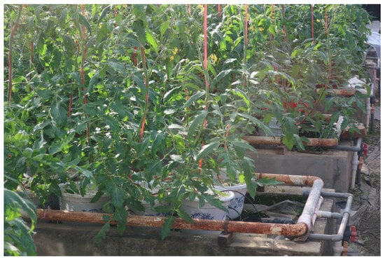 The tomato seedlings were transplanted at the BBCH 14 growth stage (four true leaves unfolded) into pots filled with perlite. Eighty plants were arranged in two rows, with 40 cm spacing between the plants within each row. No pesticides or herbicides were applied during the growing season. Standard horticultural practices for greenhouse tomato production were followed. Excess nutrient solutions were drained daily to prevent nutrient accumulation.