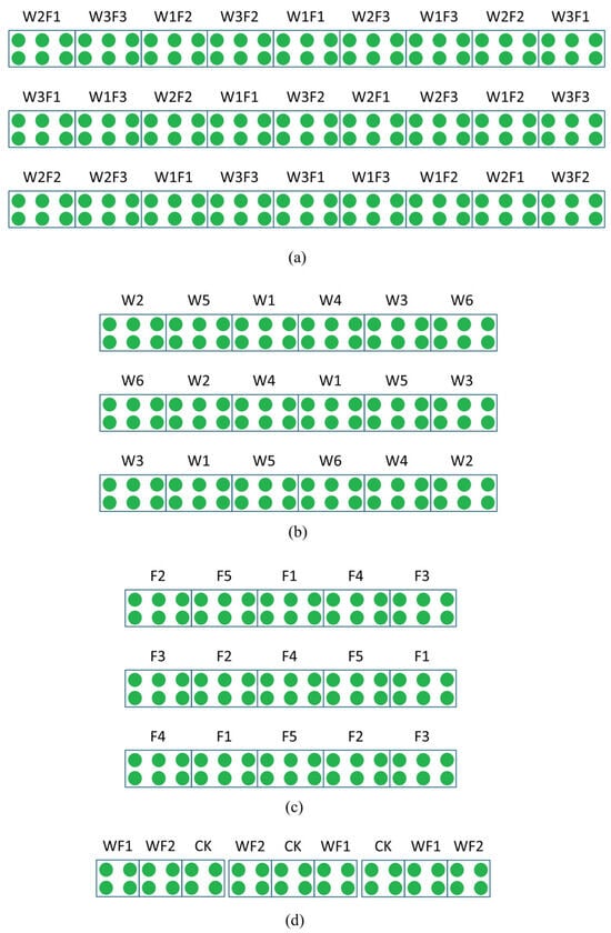 Experimental layouts for different treatment factors and replicates. Each block represents replicate, and treatments were randomized within each block. Each circle represents single pot containing one tomato plant. (a) Randomized block design for irrigation and fertilization interaction experiment (3 replicates and 9 treatments: W1F1, W1F2, W1F3, W2F1, W2F2, W2F3, W3F1, W3F2, and W3F3); W1, W2, and W3 represent 100%, 80%, and 60% of calculated water requirement, respectively; F1, F2, and F3 represent 100%, 80%, and 60% of calculated fertilizer requirement, respectively. (b) Randomized block design for irrigation experiment (3 replicates and 6 treatments: W1, W2, W3, W4, W5, and W6); W1–W6 represent 100%, 80%, 60%, 40%, 20%, and 10% of calculated water requirement, respectively, with 100% of calculated fertilizer requirement. (c) Randomized block design for fertilization experiment (3 replicates and 5 treatments: F1, F2, F3, F4, and F5); F1–F5 represent 100%, 80%, 60%, 40%, and 20% of calculated fertilizer requirement, respectively, with 100% of calculated water requirement. (d) Randomized block design for model validation experiment (3 replicates and 3 treatments: WF1, WF2, and CK); WF1 represents dynamic water and fertilizer management strategy treatment, WF2 represents fixed water and fertilizer regime, and CK represents control treatment.
