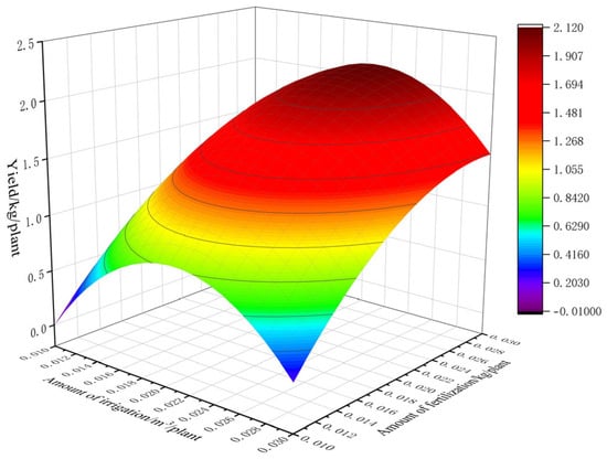 By analyzing the partial derivative of Equation (9), we determined that fruit yield reaches its maximum value (2.11 kg) when the irrigation amount is 0.0208 m3 and the fertilizer application amount is 0.0295 kg.
