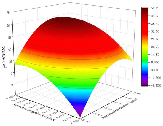 The correlation coefficient of Equation (10) was 0.823, so Equation (10) indicates the relationship between the irrigation amount, the fertilizer application amount, and WUE. According to Equation (10), the relationship of the three factors is shown in Figure 4 as a curved surface.