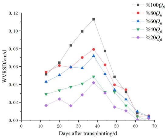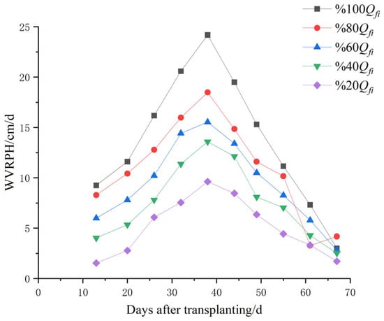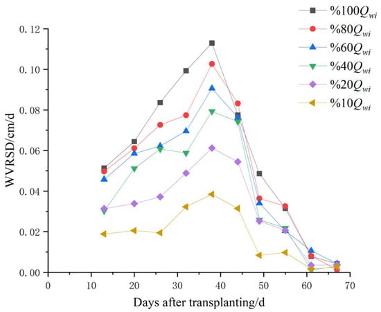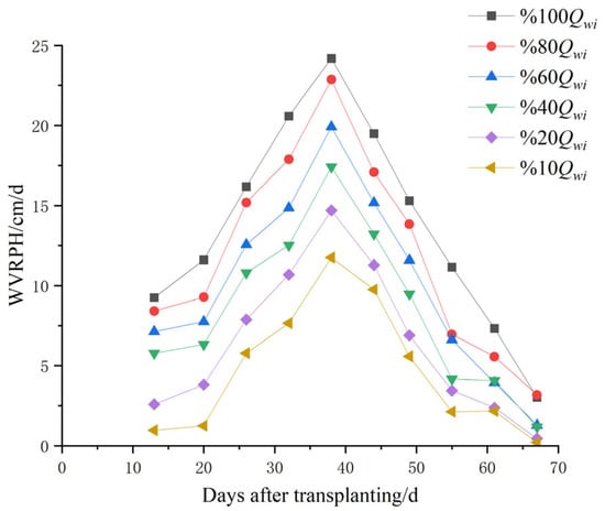 In the irrigation experiment, the stem diameter and plant height of six treatments were measured at BBCH 14, BBCH 60, and BBCH 89, and the WVRSD and WVRPH were calculated (as shown in Figure 5 and Figure 6). The total water consumption per plant for treatments W1, W2, W3, W4, W5, and W6 was 21,694 mL, 17,355 mL, 13,016 mL, 8677.6 mL, 4338.8 mL, and 2169.4 mL, respectively.