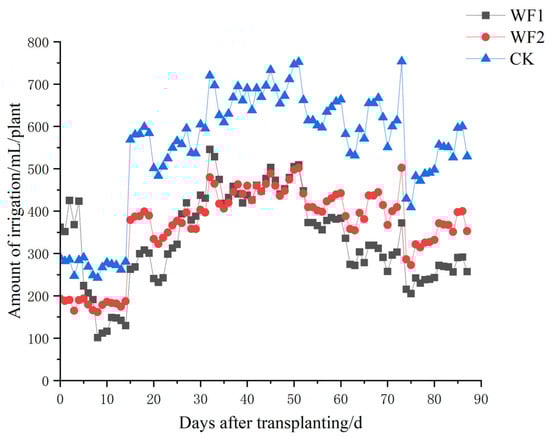 The environmental conditions, specifically the mean daily temperature and relative humidity, were recorded throughout the experiment (Figure 9). Figure 10 and Figure 11 illustrate the daily irrigation and fertilizer application amounts per plant for each treatment group (WF1, WF2, and CK). The total water consumption for treatments WF1, WF2, and CK was 20,609 mL, 20,616 mL, and 30,924 mL, respectively. The stem diameter and plant height of the tomato plants in the WF1, WF2, and CK treatments were measured during the seedling and flowering stages, as depicted in Figure 12 and Figure 13. Tomato fruit yield and WUE for these treatments were recorded at the end of the entire growth period (Table 6).